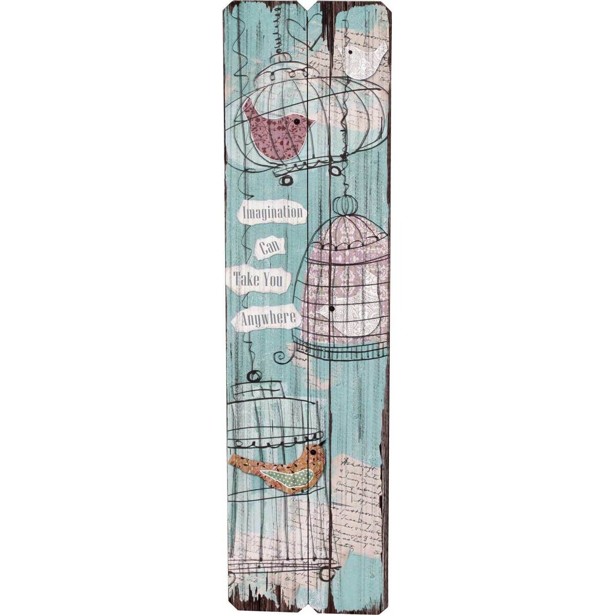 The vertical piece of wood has a pale blue background that features three birdcages with a happy and colourful bird in each one. In between them in black lettering reads, "Imagination can take you anywhere." While it's a lovely decorative accent to put out for spring, it would look wonderful in your home year round. Whether you put it on your mantel, on your front or back porch, or right on your living room wall, it's going to be a great addition to your home.