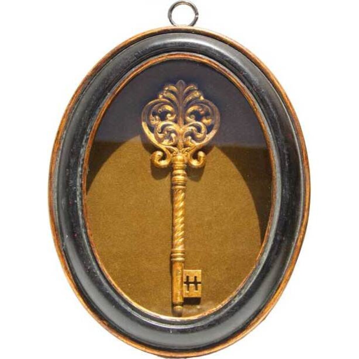 These beautiful black oval frames have a brown background and resin antique - style skeleton key sitting right in the middle. The frames are worn to give them even more of an aged feel, as if you found these pieces on the shelves of an antique shop. A round loop at the top allows you to hang these items from anywhere you desire with ease. Put them anywhere in your home where you need an added touch of style, such as in the foyer, kitchen, or living room.