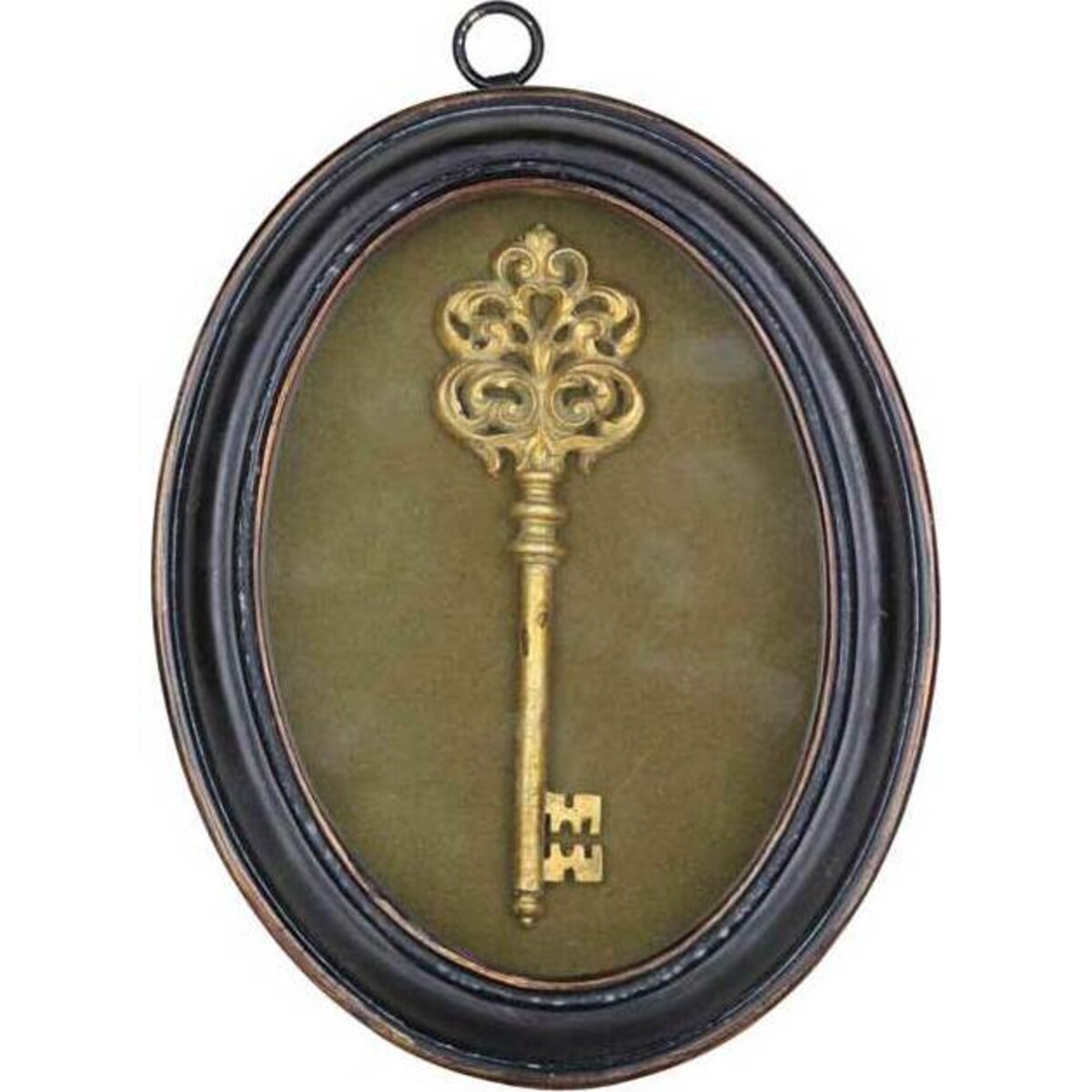 These lovely pieces of artwork consist of a black oval frame with an olive green interior and an ornate gold skeleton key over it. At the top is a single round loop hook, which makes these pieces easy to hang wherever you desire. Put them in a foyer or anywhere else that could use a little touch of antique beauty and fabulous design. They may not be the real deal antiques from a bygone era, but no one has to know. We promise we'll keep your secret.