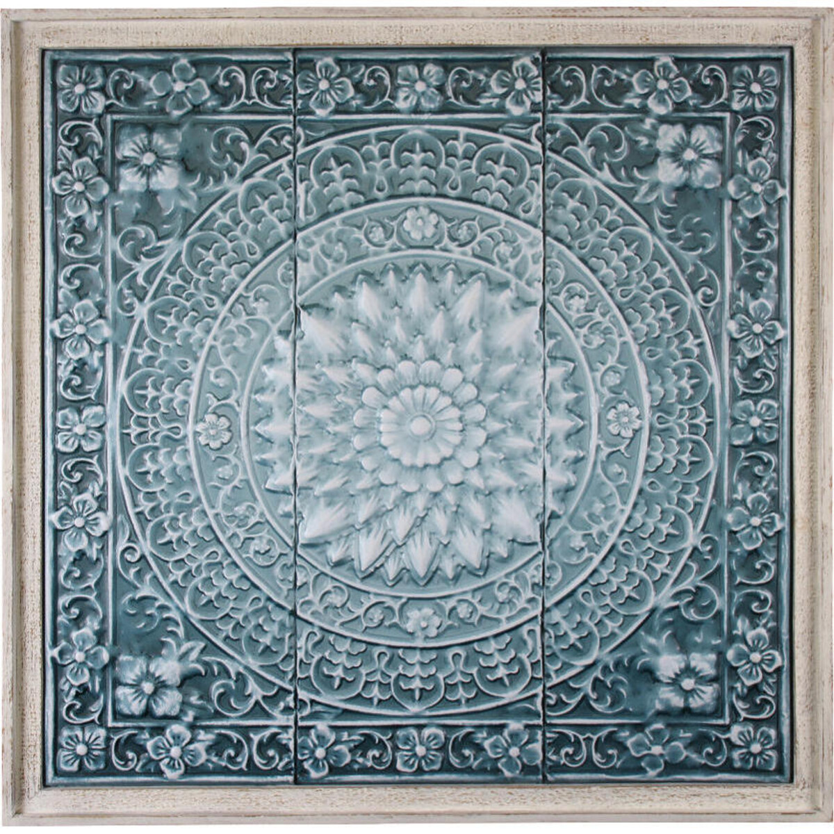 Intricate details have been fused into this single wall accent that completely will change the very look of your space s if antique and heritage looks is what you wish to create. The plaque is square with 85 cm sides that will help bring a great deal pf focus in your spaces. The farmed wall art is a subtle teal coloured piece whose embossed metal pattern adds a touch of depth and dimensionality to your space. Can be used in the living room or passage and its beauty will get further enhanced when placed alongside a source of light that will help throw into relief the pattern and its texture to best advantage. A throw back of medieval designs that adorned walls of palaces and ceilings of great architectural structured has been the inspiration behind this impressive piece. Make it part of your home and give it the much-needed artistic boots it deserves. The white frame grants it a neat finish and strikes a subtle contrast with its basic colour.
