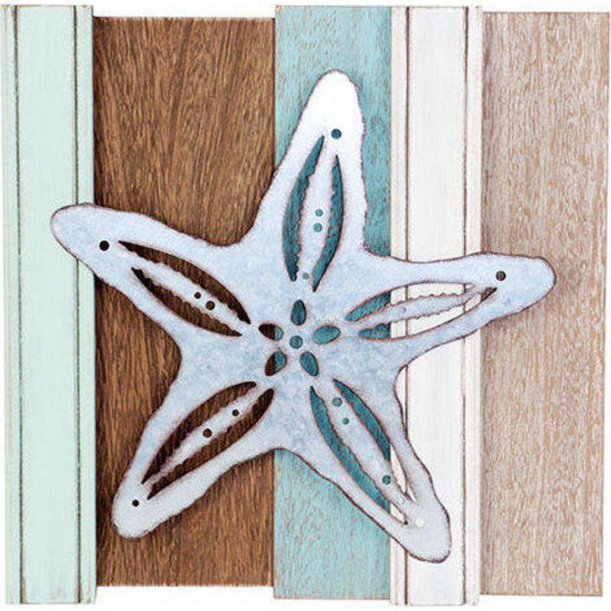 Creatures from the sea send us into raptures of wonder and amazement - their lives a mystery and yet when or paths cross, we can seldom contain our excitement. Here is one that can be a part of your décor as much because it is perfect for that marine look space you have been waiting to create but also because there is a wonderful look of rusticity that accompanies it. Made from wood and metal, the weathered board in subdued colours highlights the shape of the metal bodies starfish and allows it to bring out its beautiful details. The square plaque could adorn any wall space with its 33 cm dimensions. The superimposed feature makes the delicate cutwork design looks all the more fascinating. A wonderful accent for your walls - the kind that will be appreciated for its subtle beauty and its marine feel.