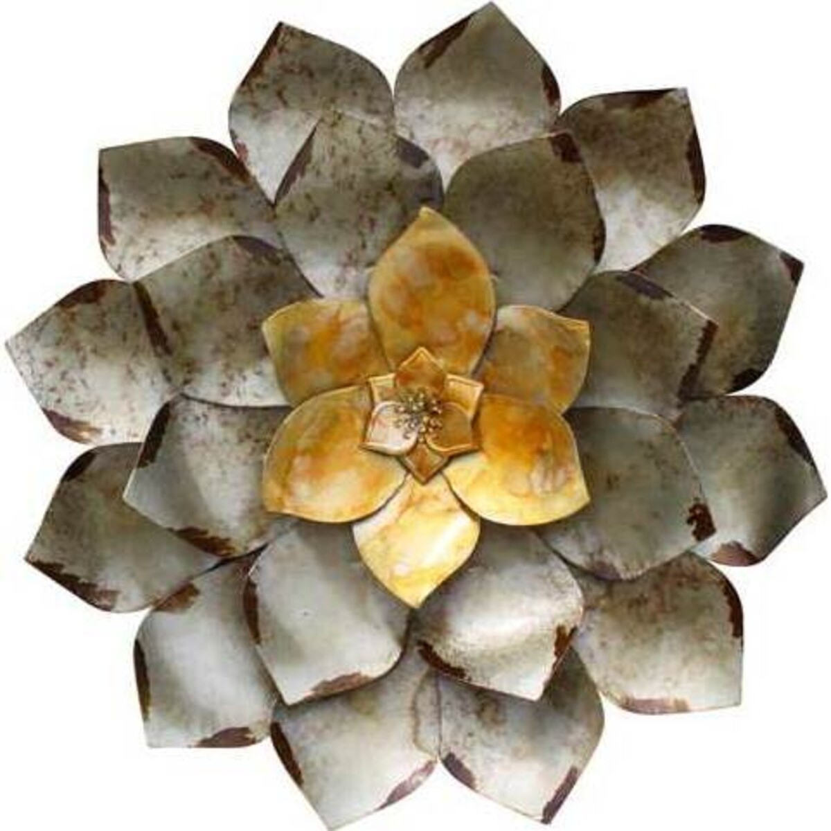 The three - dimensional Wall Flower Gold Burnt Large from LaVida is offered in an aged metal and gold finish and adds a degree of visual interest to any wall. Multiple layers of petals are accented with areas of distress and rust for an vintage vibe. In the center, bright gold - yet variegated - petals create both depth and a pop of colour. This wall accent measures 43 centimetres across and is the larger of two wall flowers available from LaVida. This piece stands well enough on its own but would create even more impact if hung in pairs or groups.