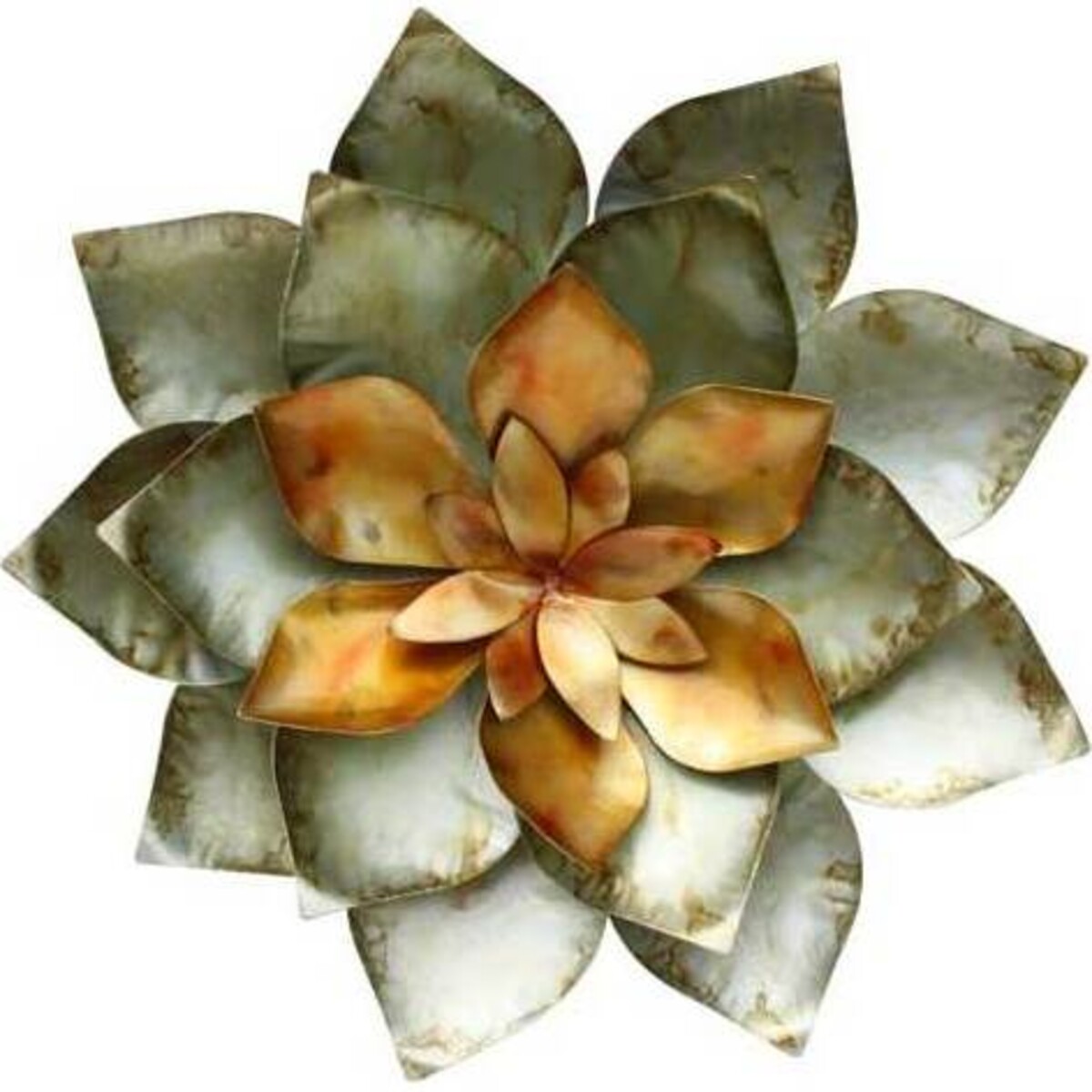 The Wall Flower Gold Burnt Small is the smaller of two in a collection of floral wall accents from LaVida. Multiple layers of three - dimensional petals create a lush, almost tropical look to this accent piece. Finished in a natural, aged metal with hints of rust, this wall flower exudes a timeworn look. A centerpiece of petals finished in variegated shades of bright gold adds just the right pop of colour. This wall flower measures 39 centimetres across and can be hung alone or paired with its larger counterpart for a wall grouping with maximum visual effect.