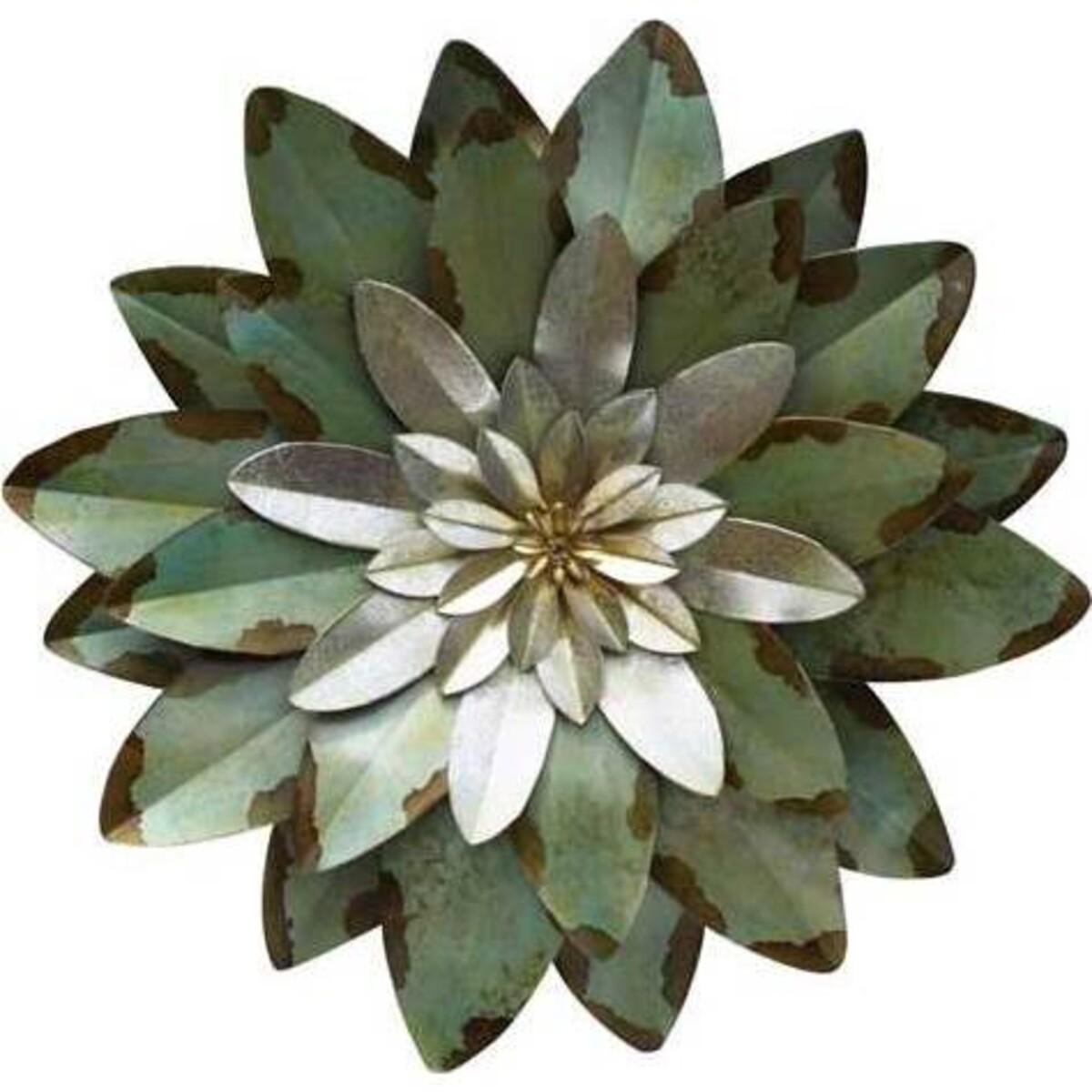 Natural silver, sage green and rust combine beautifully in the rustic Wall Flower Silver Centro from LaVida. This three - dimensional wall flower features multiple layers of petals in tones of sage green with distinct areas of rust for a weathered look. In the center is yet another bloom comprised of several layers of natural silver petals in graduated sizes. This wall flower measures 46 centimetres across and is subtle in colour but well - defined in vintage style and visual impression. This wall flower can hang on its own or be hung in multiples for a stunning wall display.