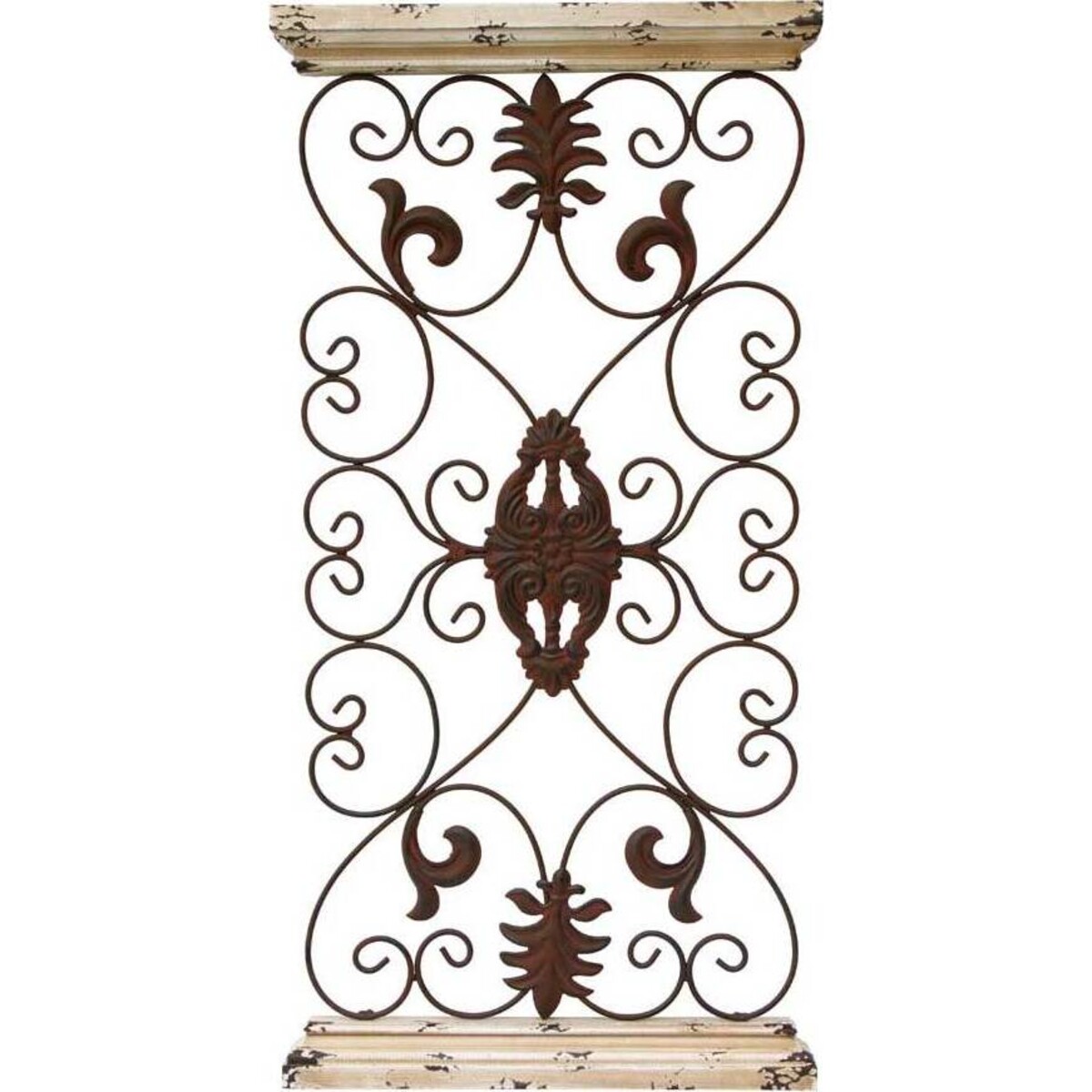 Wall Panel Double de Lys measures 41x4x82 cm and features a framework of metal patterned out in classic style. It is rectangular in shape and held firmly by two artistically - crafted bars of wood at the top and bottom ends. This piece of handicraft can be applied at homes, institutions and other places to spruce up the outer part of walls and present an outstanding outlook. Wall Panel Double de Lys brings along the benefit of durability due to the metal applied. The wooden sections also contrast in spectacular style, adding a unique sense of design to the entire hardware piece.