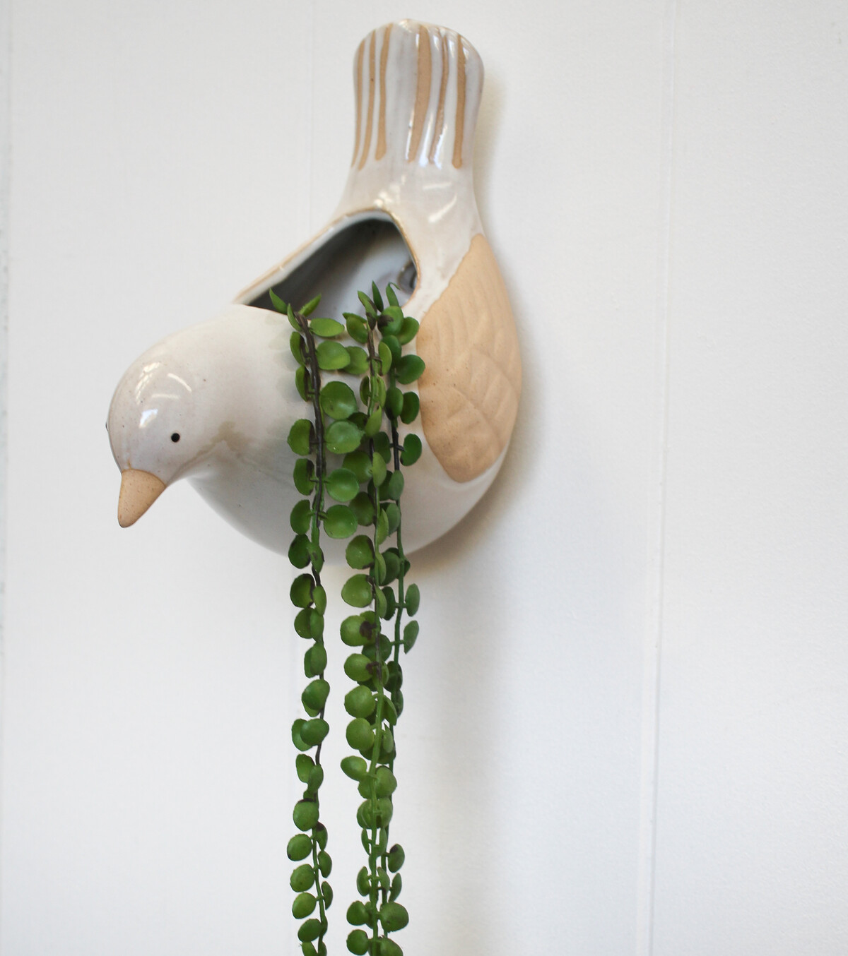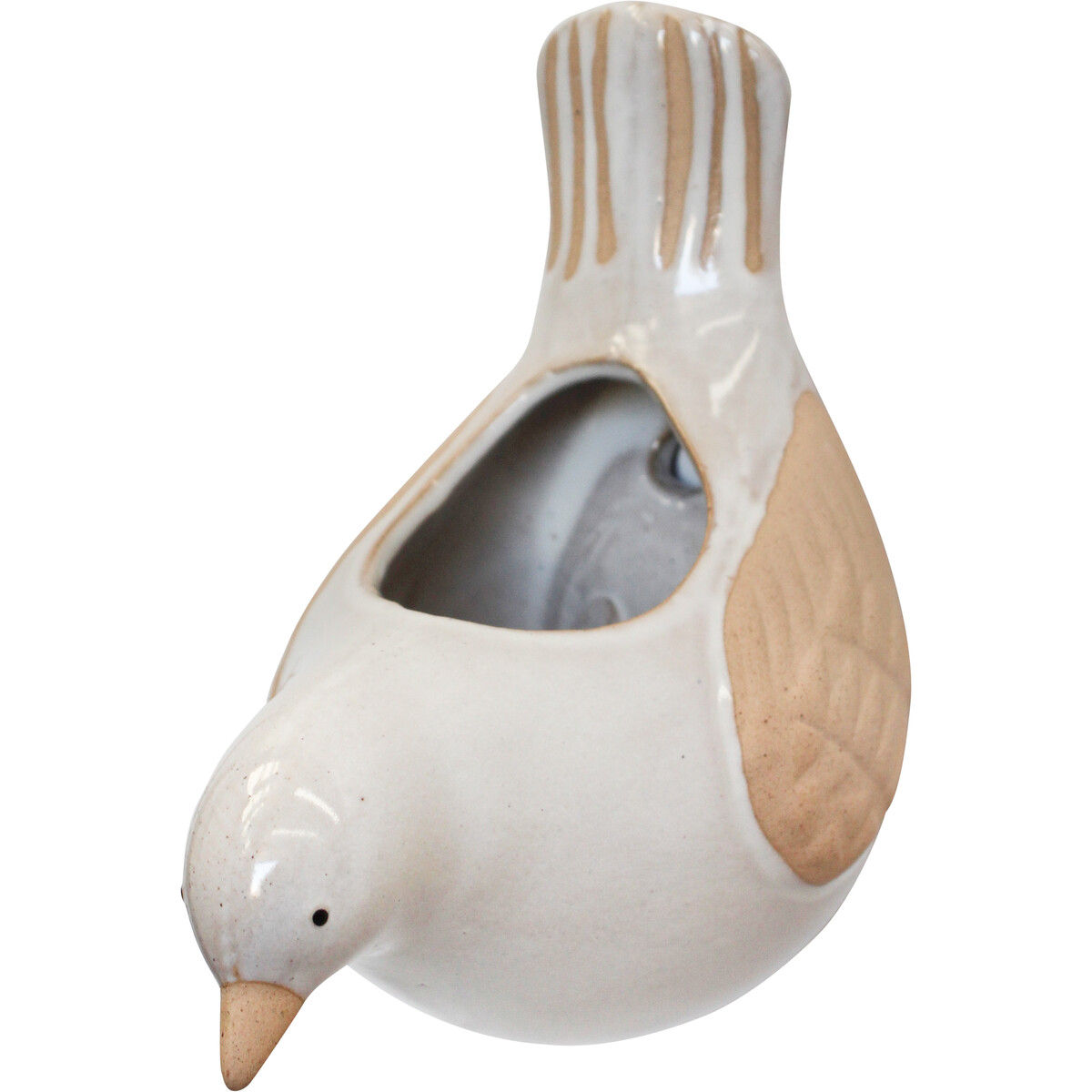 Adding fine ceramic quality planters can be a great way to begin your green project-Afterall what could be better than unique planters to set off the best look for your foliar or flowering treasures. The bird planter has a slot for hanging and it will very easily be placed on any wall. Will take in small creeper or short stemmed flowering plant whose blooms will be able to peep out from the little receptacle on the back of the bird. The stripes on the tail-the little wings in soft pink beige and the head with its beak, are tiny details adding to its utterly adorable looks.