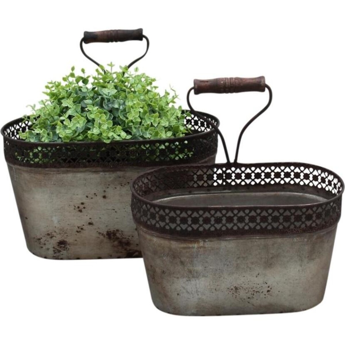 Rusticity meets chic antiquity in this set f two planters that can be placed on the walls to make them more interesting and more in tune with the kind of look you would desire for your exterior walls as well. Great for your balcony, patio or the terrace sit out where the wall spaces need to be more aligned to a certain outdoorsy look. This tub style hangable planter has size that will easily take in large foliar with as much ease as it will be great for more dainty florals. A superb blend of a tiny bit of detailing along the edges going along way in making it supremely attractive. The rustic tub is smooth with highlights of rust marks for effect while the handle with a wooden grip makes the look more farm and country in effect. A set comes in two sizes in perfect coordination with one another. You could make a cluster of such hangable along the exterior wall of your entryway or the terrace garden.