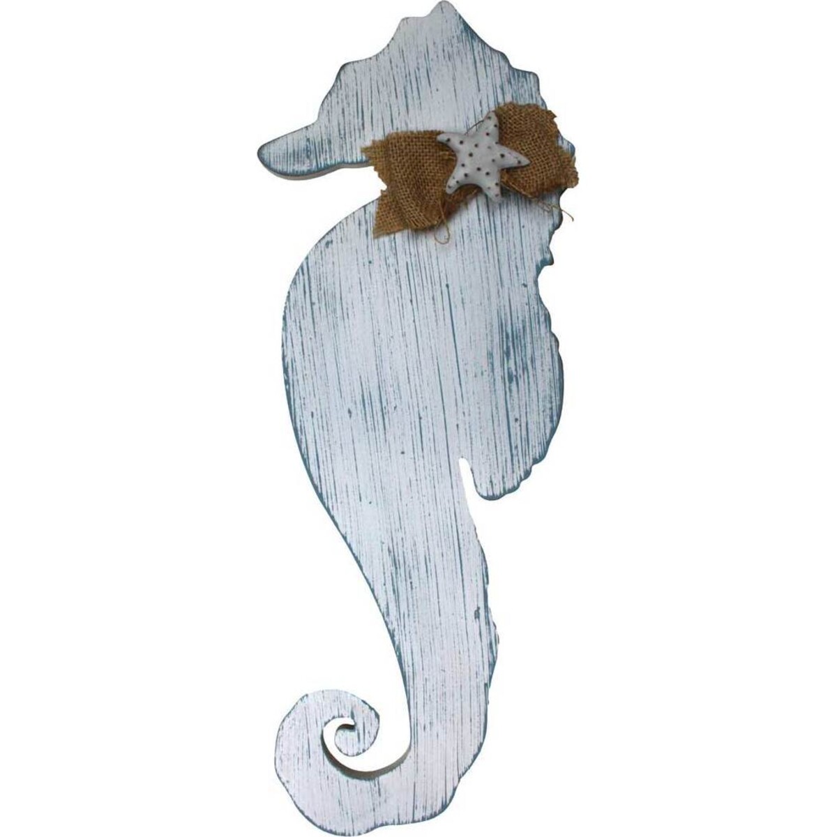 This sea horse mural replicates the gorgeous shape of a seahorse as it does happen to be one of the most fascinating of sea creatures and is supposed to bring good tidings. The outline of the sea horse has been beautifully cut out of the hard compressed board and given a white colour wash in a way that it has this outdoor weather beaten and partially washed look in white. The curling tail and the little detail of the collar made up of hessian and pinned on it - the little starfish, looks simply riveting and so very natural. Rustic charm in complete harmony with the theme of the sea and its beauty. Almost 50 cm in height, it is big enough to create its own presence - more so with its very fresh and organic look - placed outdoors near the poolside, or if one is running a restaurant, as an outdoor embellishment, at a bar, or simply in the children's room - the seahorse can blend into any space that needs an attractive decor idea to change its feel completely.