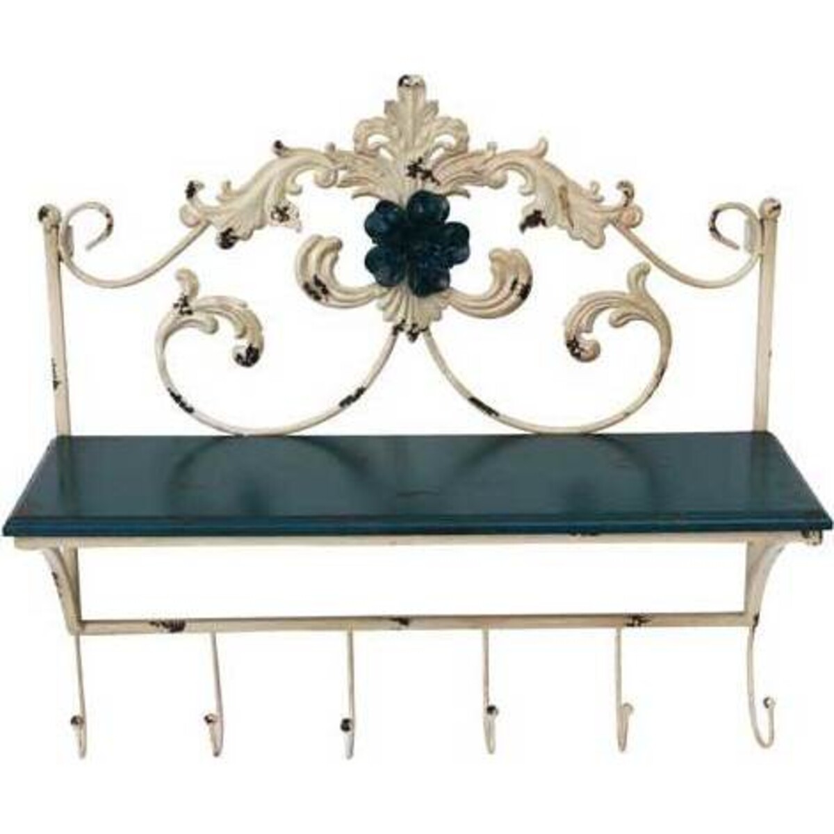 Wall Shelf Leaf Hooks has measurements of 56x19x54 cm. It comprises of a wooden bar of dark tone supported on a framework of metal with a number of hooks at the bottom. This piece of hardware offers the advantages of multiple usage and ease of access. They are highly suitable for installation within the kitchen wall. It may as well be utilized within a workshop environment, where its ruggedness would be an advantage in case of hits. A beautiful pattern is visible on the top framework of Wall Shelf Leaf Hooks, with a flower crafted at the middle.