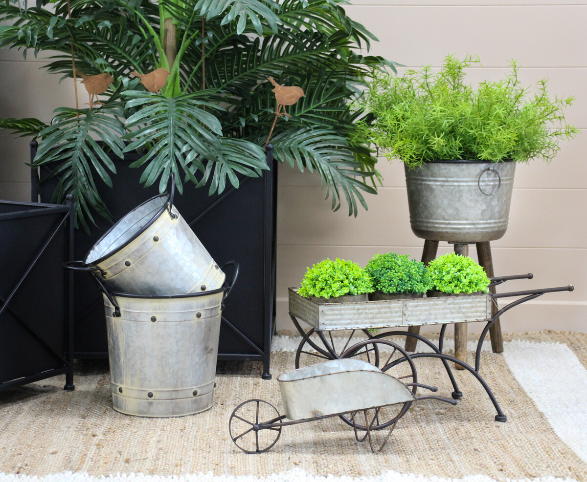 Made of metal, the wheel barrow design is quite evident in the very shape and structure that has been so immaculately recreated in miniature form. The typical single wheel, the handles that help you heave and push with all your might and the two supports that lie right under the handles so as to help support the tiny vehicle in case you need to. The upper platform has a raised rim and despite the wheel barrowing all of 41 cm in length and a mere 14 cm in height, it has all the right kind of features that makes it look like the real thing. Add the charm of areal farm and country style symbol that will enhance the display of your plants and make them look stunning and well arranged.