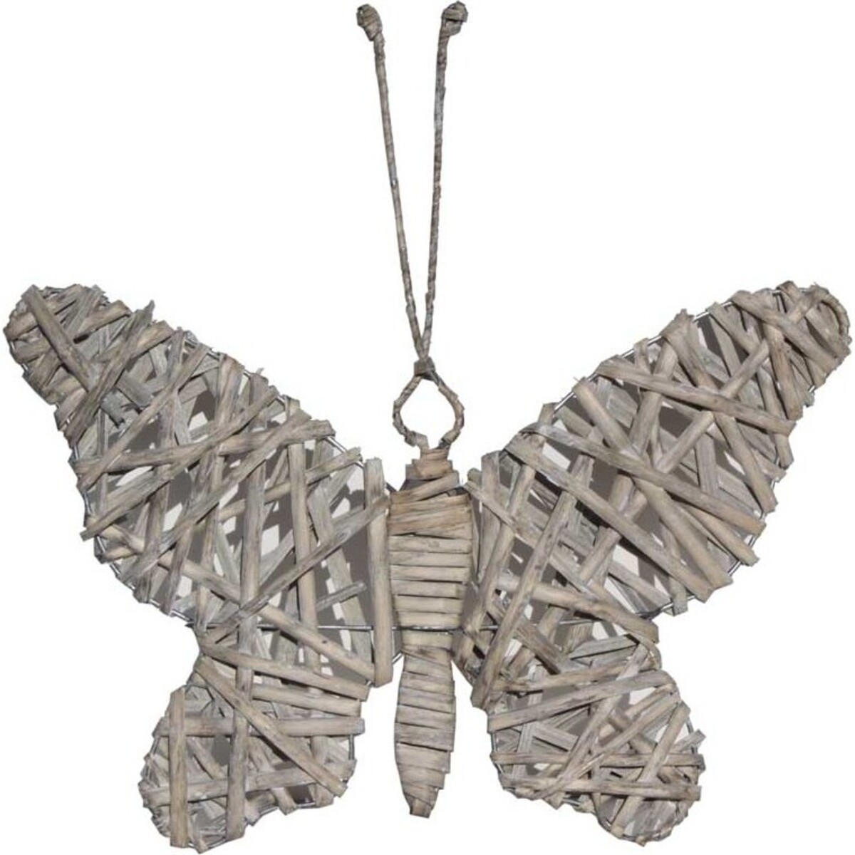 The plain butterfly flutters around at night. A grey ornament this storm coloured butterfly is woven together out of soft, neutral fibers that intersect around a hollow center of the abdomen and wings. Now you can bring that niceness to your very own home or place of business. The grey Weave Butterfly can be placed in a variety of places for decorative purposes. It makes a really nice ornament. But like real butterflies these woven versions look good almost anywhere. Try hanging them from your favourite plant. The woven butterflies look great while affixed to a wall, especially in rows of more than one. It does double duty as a hanging ornament as well as a piece of wall art. Or what about scattering them around that errant book shelf or display?
