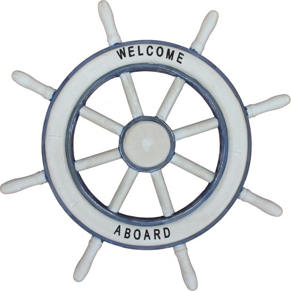 Blue detailing surrounds the center and outer edges of the wheel while the rest is a vibrant white. ?Welcome Aboard? is printed in black on the top and bottom portion of the decorative piece. While the decorative accent would be ideal to use in a home that's styled in a nautical or coastal theme, it would add a touch of class to any room. The piece would look especially beautiful in a hallway or on the front or back porch. When you can't get out on the boat, at least you can bring some of it to you.