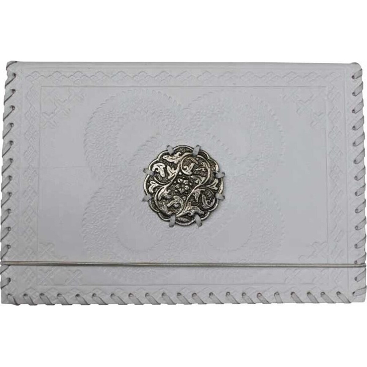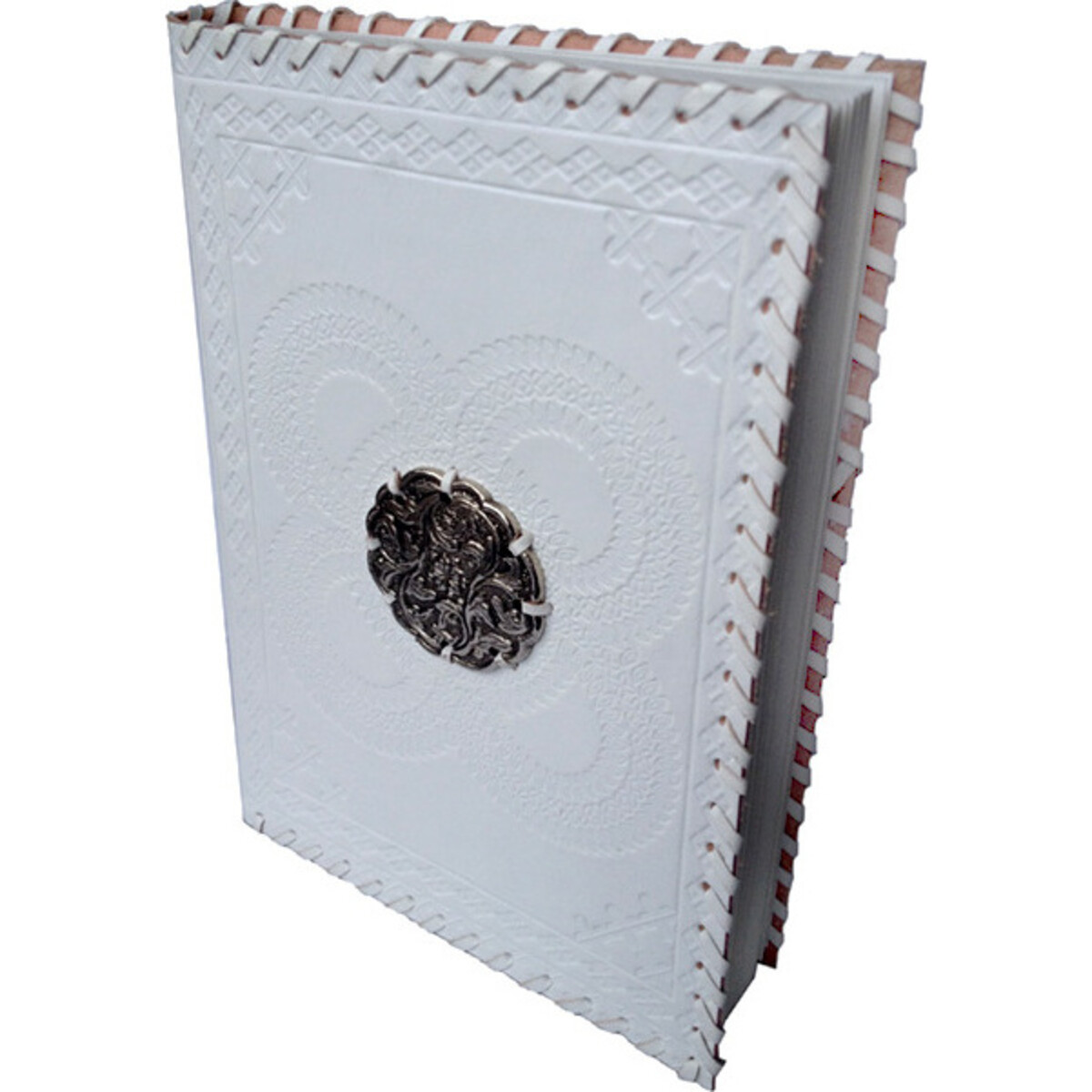 Talking about style, the all-white leather covering of this classy notebook features a beautiful Victorian design. The white leather covering has detail-rich embossed patterns that create circular details on the middle and diagonal borderlines along the corners. The framing of the notebook is also finished with a leather lace stitched along the borders.