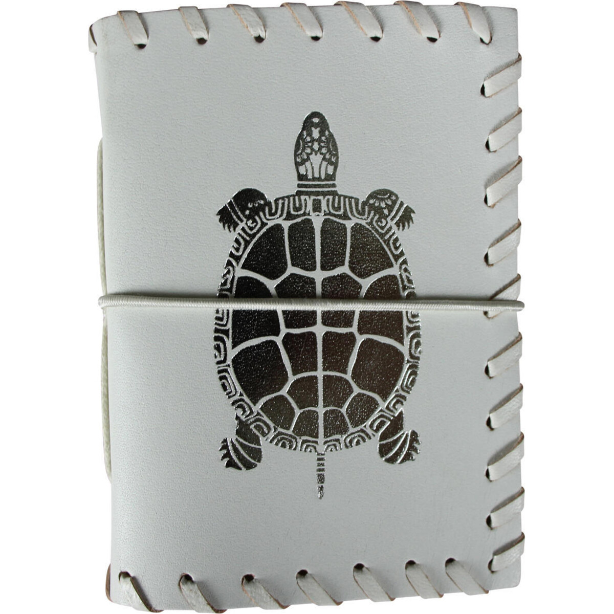 The white leather cover does much justice to the adorable turtle print adorning the face of this notebook. The leather string weave that edges the diary lends it a beautiful detailing - very rough and utterly desirable for its rusticity. This handy journal style compact notebook is as great for your notetaking as it is for placing on the desk for those hurried pointers and things to remember.