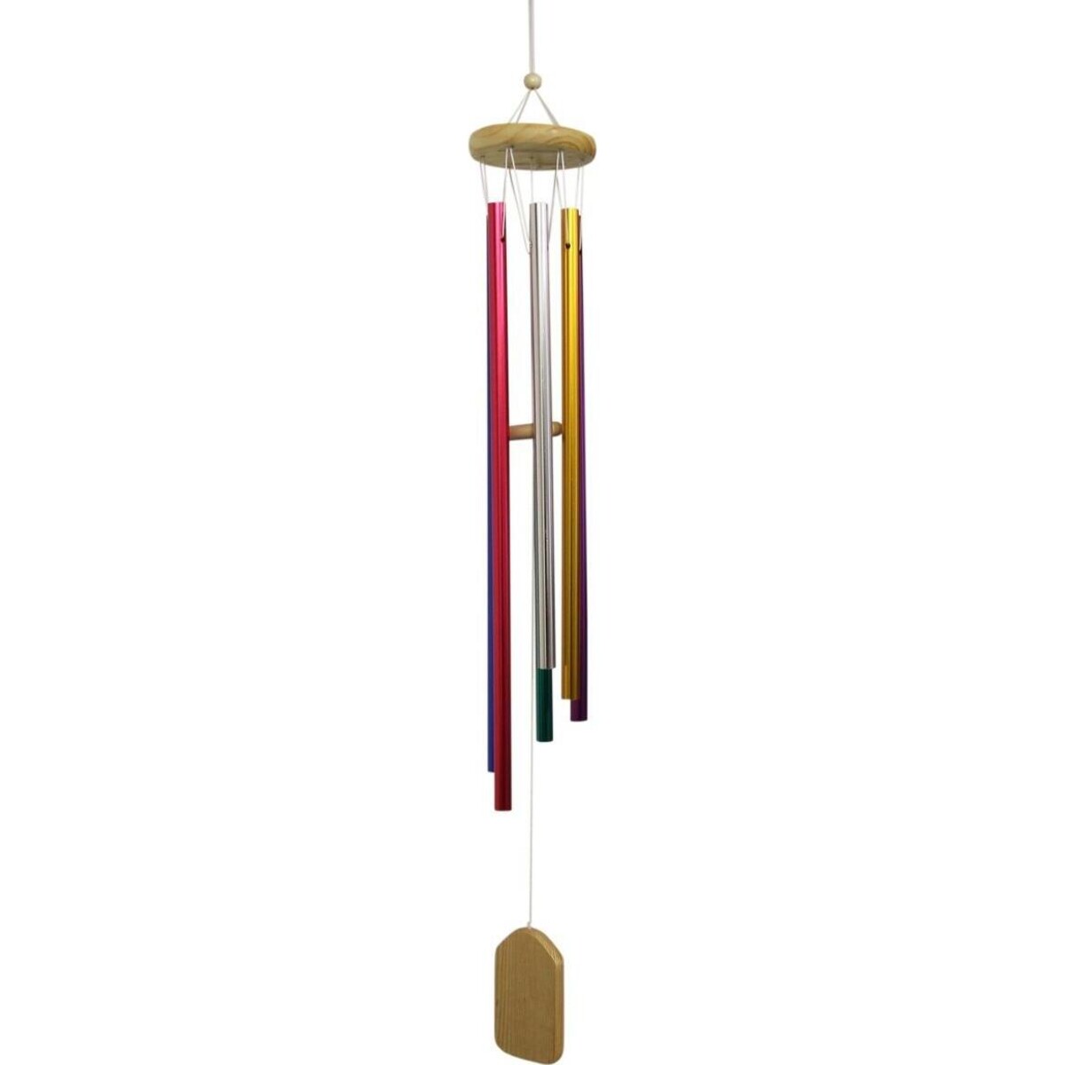 Sound affects the mind and your mood and one of the best means to ensure that you have the best in acoustic backdrop - is by adding wind chimes. This superb blend of colour and simple basic design makes it an attractive pick. Add this chime to your window and delight in the manner in which the light and the wind will change the very mood of this space. The height of the chime is all of 76 cm with its wooden disc in a natural wood colour from which the tubes in metal hang. The colourful presence is marked also by the natural touch of wood that makes up its lowermost extremity and the top most disc. Add this to your home and invite not just a sound that elevates the spirit but also helps render your home more open to positive influences that are attracted through its lilting soft tinkle.