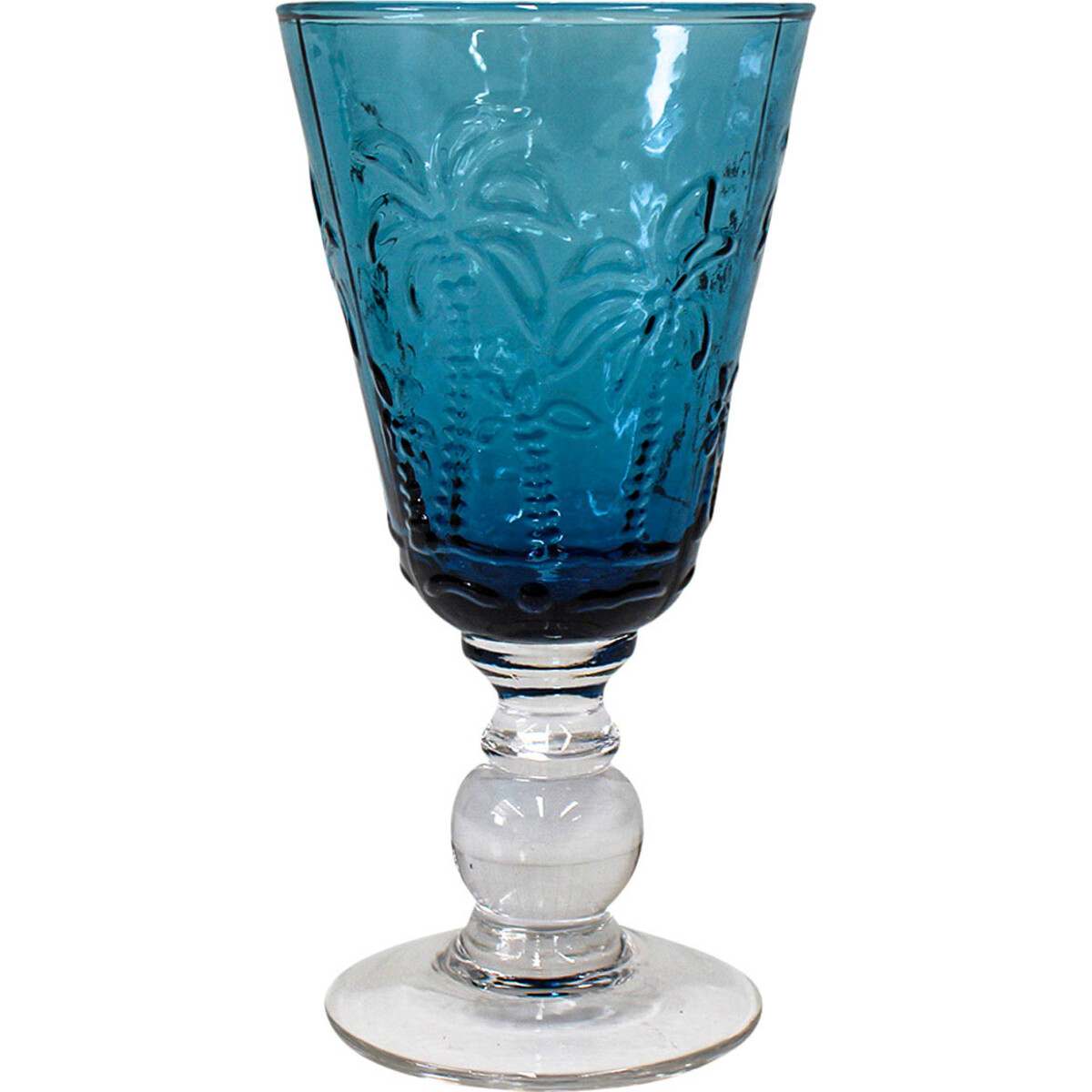 For a summer nostalgic piece, Wine Glass Palm Sapphire brings the beach indoors. This wine glass is made from one of nature's vital materials. The chemical component would not get infused into one's wine. The glass features chemical inertness and does not react with other elements. Natural aroma is not influenced and wine will taste and smell exactly how it should. When Sapphire is used for aesthetics, it communicates wealth and luxury. This glassware is a beautiful addition to one's bar. It is a beautiful centrepiece with a palm embellish that says summer. It is sturdy and durable for everyday use and also for use on special occasions. Use this item to spark conversation in outdoor events.