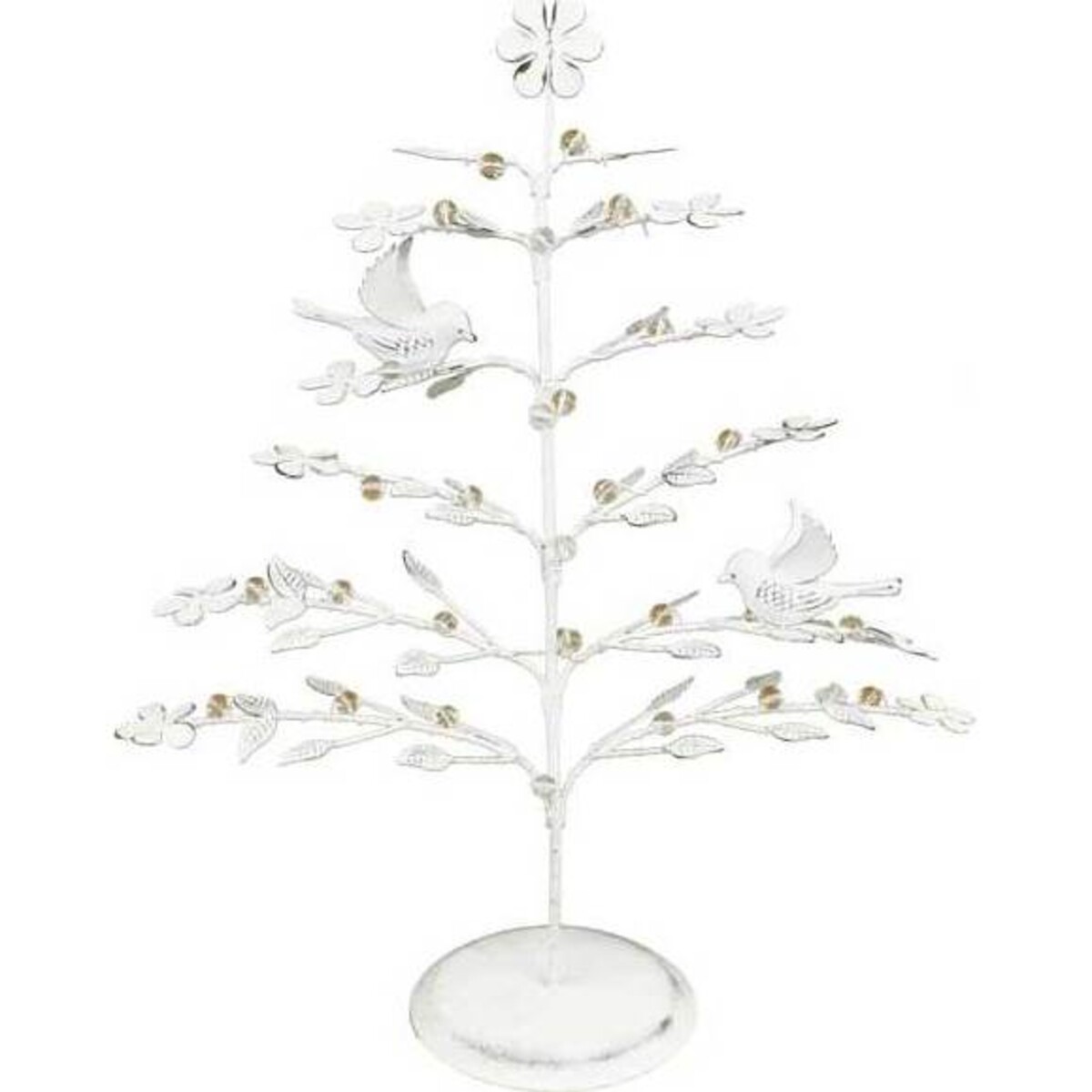 This all white piece consists of a wire tree decorated with tiny leaves and flowers as well as two birds sitting on the branches and a single flower at the very top. Little clear crystals add a bit of sparkle and shine to the piece. Thanks to its base, you can easily place the item on any flat surface you desire without worry that the wire tree will flip over. Keep it out only for spring or use it year round, but it's going to be a lovely addition to your home.