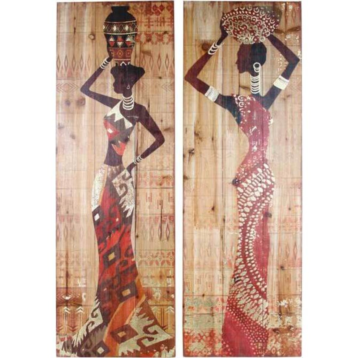 It is the brilliant print of their costumes that captures the eye at the very first instance. The bold and bright print écolours of the earth - ochre, amber, brown and burnt orange - so warm and rich in their tones - one can almost smell the earth as if after the first rains. The women carry pots on their heads like they are heading home with water from the nearby pond - a picture of such elegant beauty yet so very connected to the reality of life. This set of two pictures will look fabulous in any room that needs a statement decor piece or the one that already has tribal theme. Added on could be tropical plants, some rugs and copper vases and the look would be fascinatingly different. It is in the detailing of the print wherein lies the beauty of this fine set of wood print art.