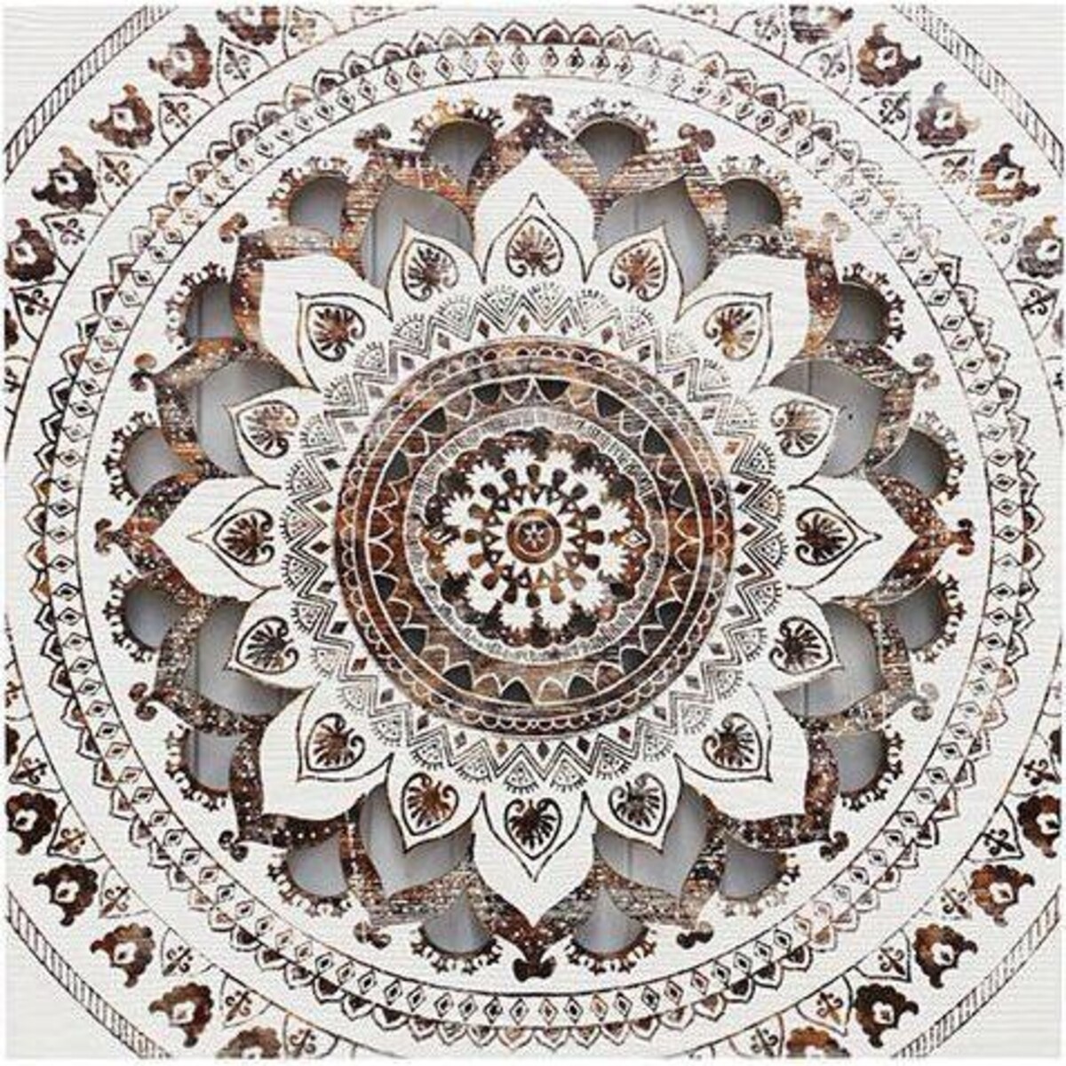 Adding patterns and designs in larger frames, in your home always endows it with a sense of classic beauty. After all the design has been on some of the most famous of buildings or other surfaces because of an artist's imagination. To replicate the same on a surface like wood adds a dimension and a texture that is unique. The wooden backdrop gives a certain colour density to the hues while its roughness, grains and whorls add their own stamp of identity that is so very pleasing. Here is a perfect example of how the stark whiteness in the design makes the depths and the dimension of the carving look as if it truly has been created on rock. It feels like one is looking at a lotus opening its petals for you to peep into its world that is filled with unimaginable beauty. Add this kind of art to any room , be it personal or commercial as it encompasses an idea that would fit in anywhere. The art work is square and has 80 cm dimensions.