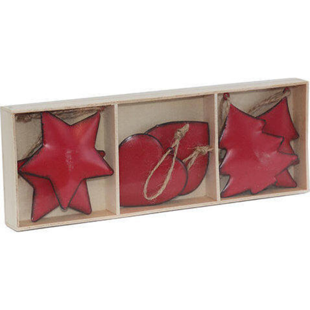 Adding touches of great décor pieces to build in the Christmassy look is rather an easy task with what Lavida has to offer. This wooden box comes with metal crafted trees, stars and hearts which could be used like any tree ornament and when not in use could be tucked away for the next season in its own case. The lovely antique burnished red colour adds more charm to its look. The light weight articles could be suspended with ease from trees, the window rod, the doorway or when you have a get together in the outdoors would make a splendid splash of red when placed on branches. There can never quite be anything more in keeping with the season that these three etetrnal symbols. The compactness and the convenience of having them come in such a pack of course makes it all the more covetable. The size of the ornaments is about 8 cm in height and around 7 cm in width. The box itself is 22 cm in length and comes with three compartments. Could be gifted at housewarmings to those who would be celebrating their first Christmas in their new home.