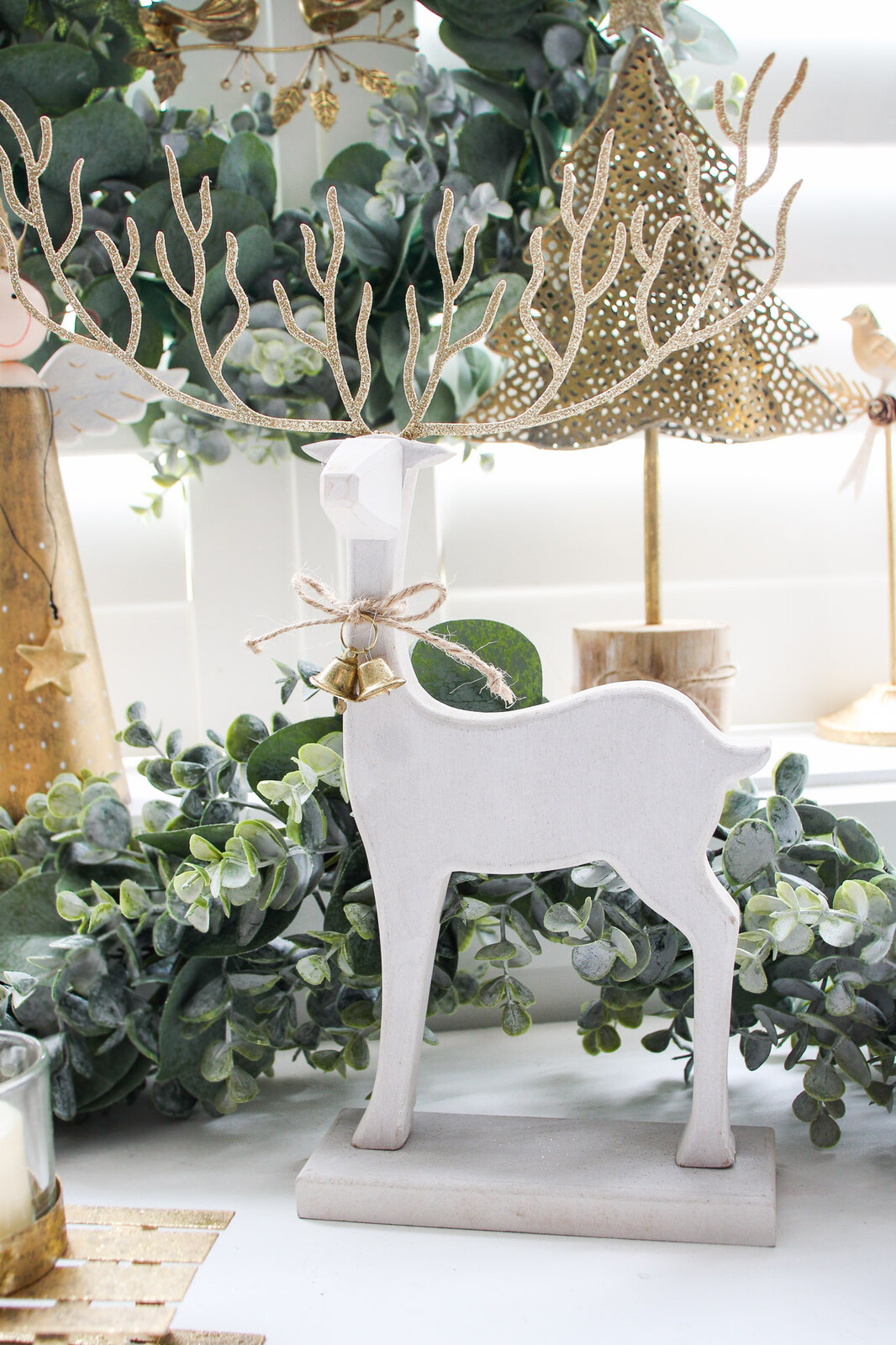 The Wooden Mystical Reindeer, with its intricate antlers dusted in a shimmering hue, conjures a serene sophistication that invites the warmth of the winter holidays into the room, regardless of the season. The delicate bell around the reindeer's neck adds a touch of whimsical allure, promising to captivate and charm onlookers with its quiet jingle and glittering finish.