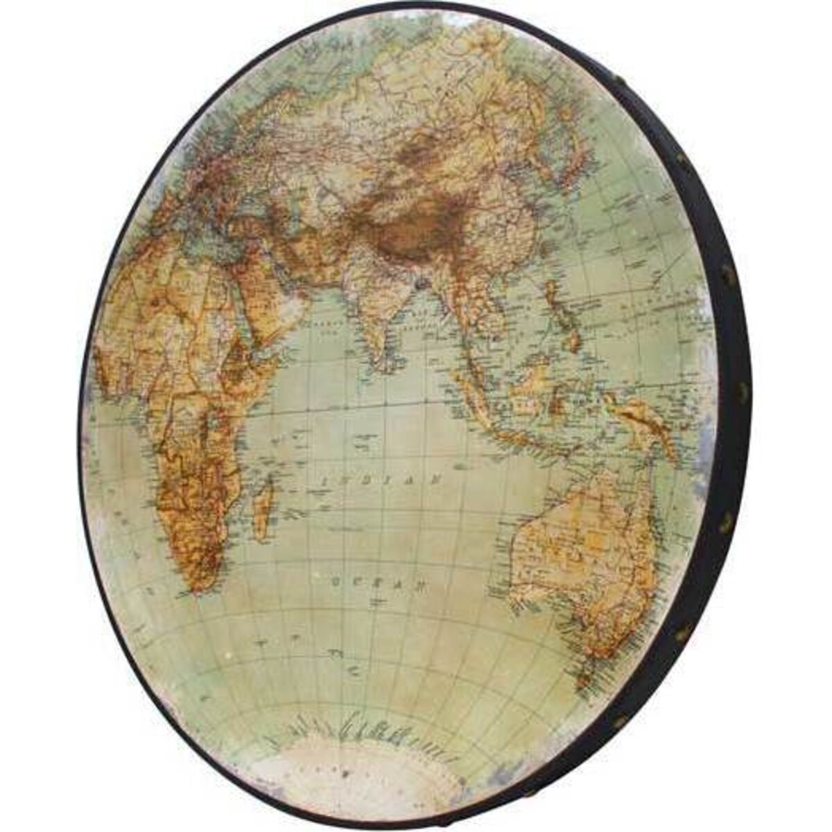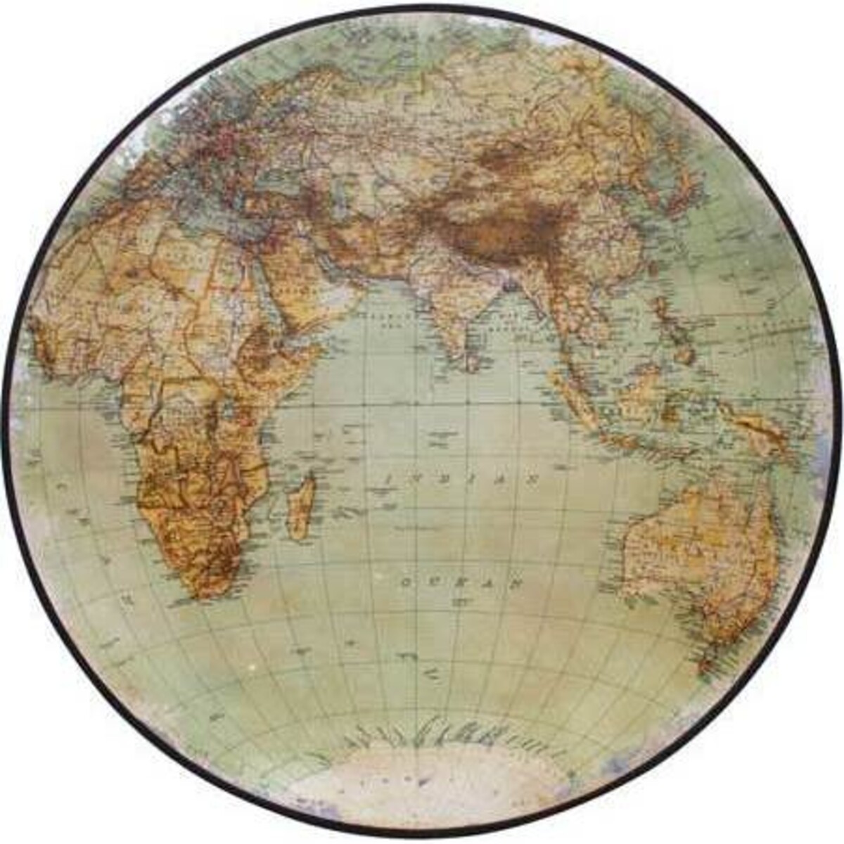 Lovers of maps and all things geography will appreciate this large World Map from LaVida. Both Eastern and Western hemispheres are depicted on the very detailed and labeled image. This oversized wall hanging is finished in Old World tones of muted greens, golds and browns. This perfectly circular map measures 81 centimetres across and is five centimetres thick. It also features a thick band of black around the edge for added definition and depth. This map would make a fitting addition to a personal study or as the focal point on a wall of a large room.