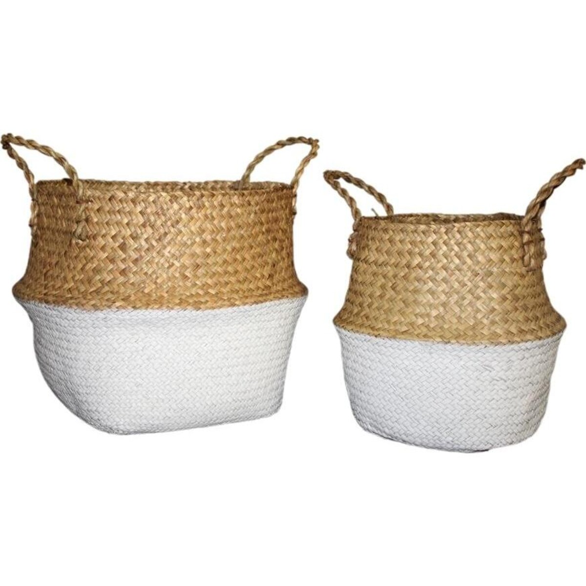The weave is soft and pliable-yet the built of the basket is quite solid and tough-here is a set of two soft bellied baskets that have handles on the sides and that are sized and created keeping in mind the need in modern homes for organizers that are durable and yet are the kind to lend a look most attractive to the spaces. A functionally relevant set of baskets that pack in the beauty if a natural origin material woven with much expertise in traditional manner that makes them quite a wonderful way to keep your home well organized. The larger of the two baskets is about 40 cm in height while its handles allow you to lift and carry whatever you may have decided to use it for, with ease. The smaller basket is about 36 cm in height. The lower portion of the baskets’ base has been washed in white colour, making its appearance all the more attractive as the white and golden beige of the natural fibre combines with such elan. Practical organizing options from Lavida have truly come of age in terms of design and functional astuteness.