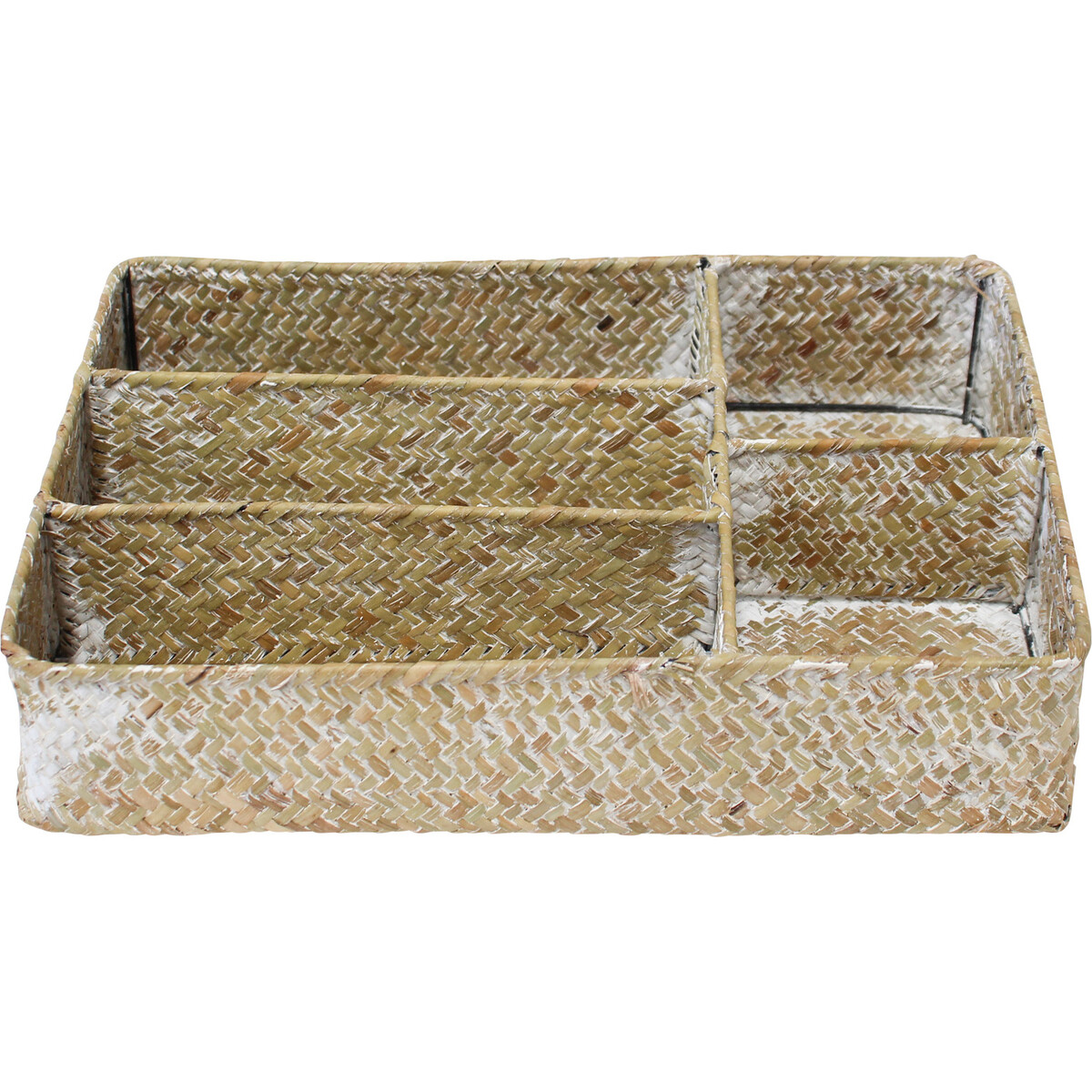 This rattan woven natural finished tray with five compartments is the ideal companion for the kitchen or the dining table when reaching out for cutlery neatly laid out is important to make the table look clutter free. One can simply wash and wipe and keep the necessary pieces in these well designed compartment that will provide sufficient space for many items in it. The length of the tray basket is about 37 cm and the width is 28 cm and the height about 5 cm. The look of a country and farm feel comes right through. This innovative design helps keep the kitchen table also looking clutter free. It could also be as great as a stationery organizer for the kid's room. The hand - woven design and the natural colour finish makes it a fuss and frill free little basket organizer that would be not juts useful but also add the air of neatness and organic freshness to your setting , be it on the study table, the kitchen table or anywhere else. Its size is such that it would fit into most cabinets as well.
