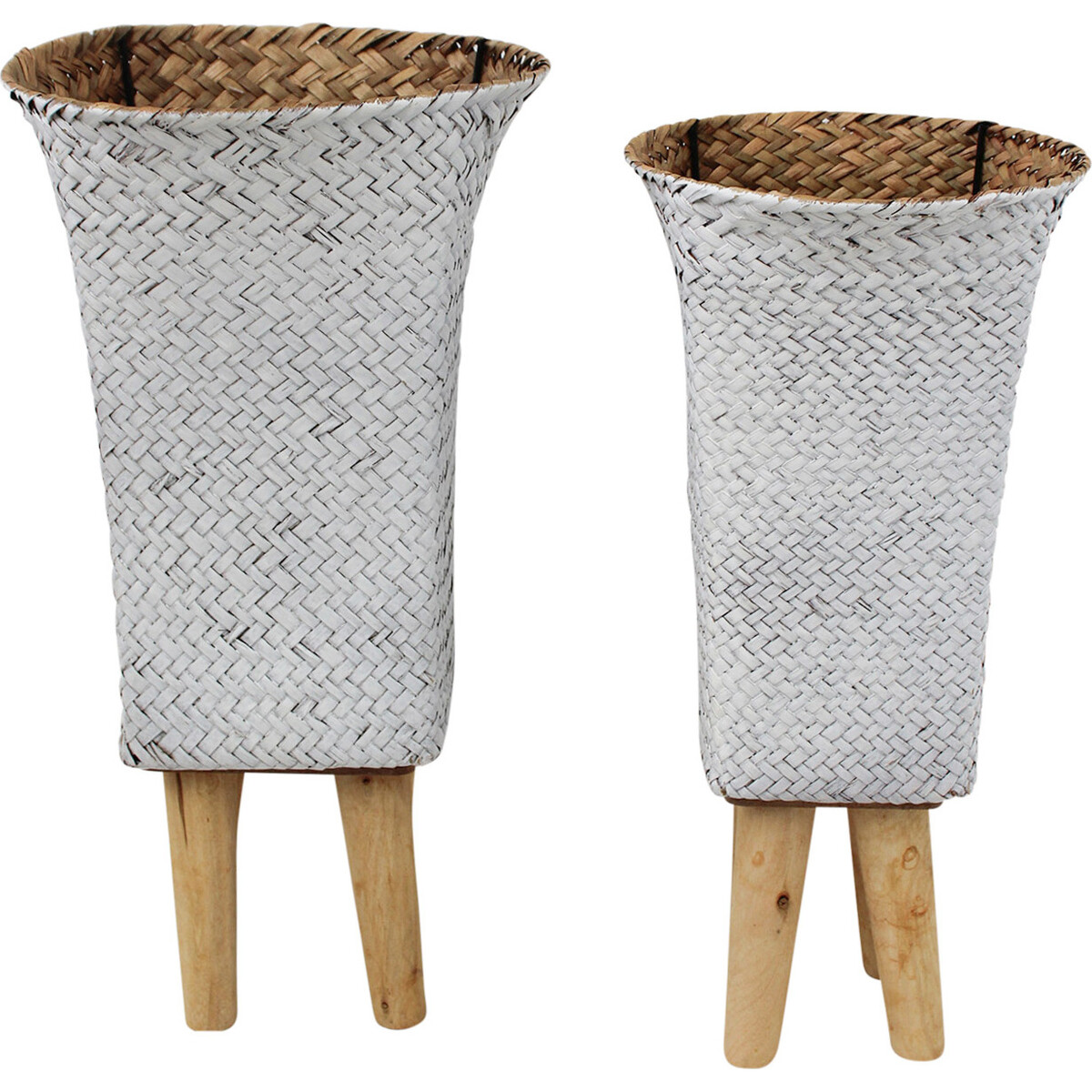 Tall and graceful, both the small size and large size version of this Woven Long Planter White/Nat S/2 makes a big and bold visual statement. Each of the two differently sized planters in this set is held up by wooden legs which were specially constructed to provide optimum balance and support to the basket itself. As a result of this ergonomic wooden stands, any of this baskets can be placed conveniently on any flat surface. It can be used as a planter in the living room, lobby, bedroom, porch and wherever else you customers wishes to place it.