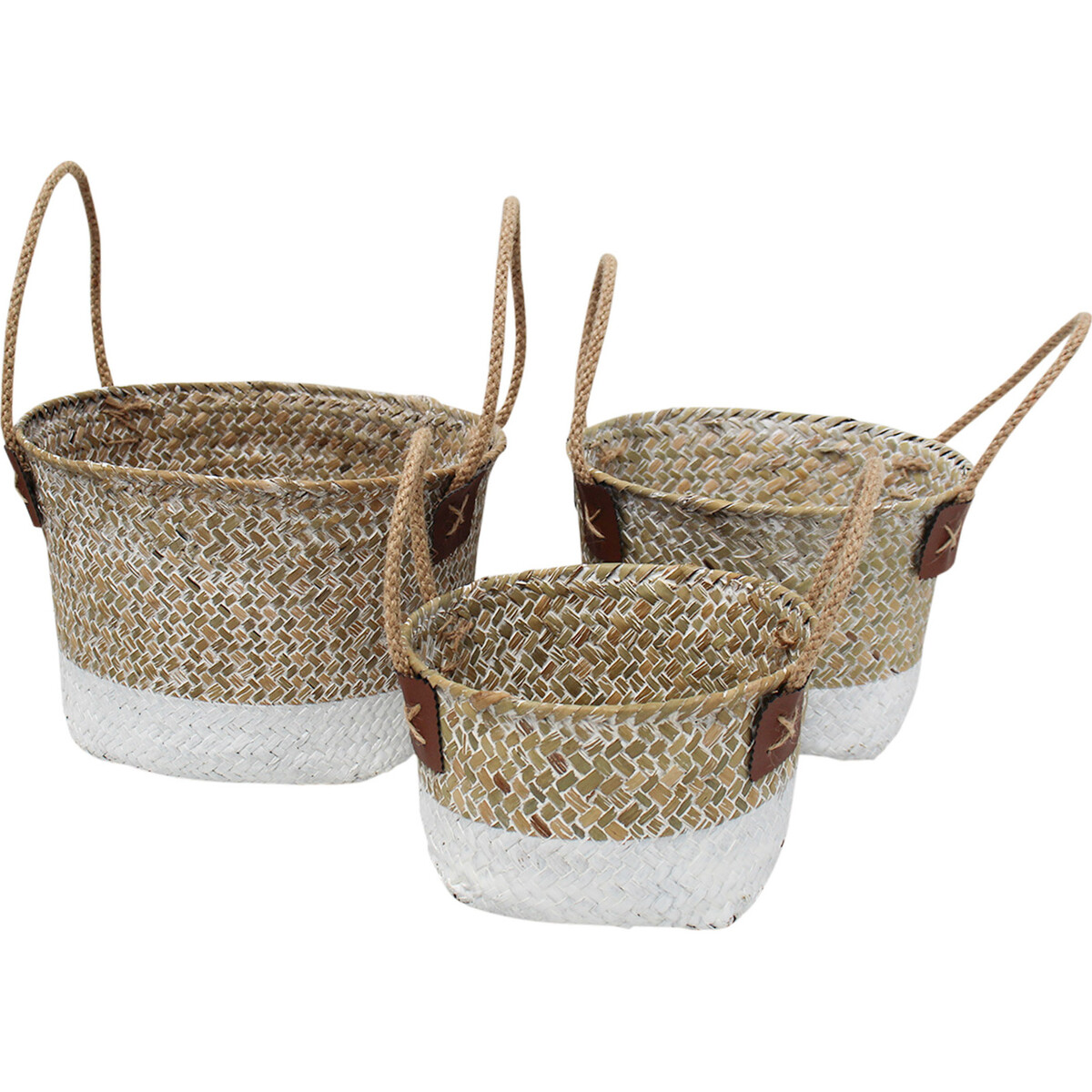 Aesthetically charged given its generally whitewashed painting, a lavishly painted white base and brown coloured leather, this Woven Planter 2/Tone S/3 is certainly a rustic themed basket planter that customers would love to have in their possession. Apart from its ornamental allure, it is also made in a perfectly functional design. Each basket is woven in a round shape using straw material, while attached to the sides are strong ropes. It is made in a dimension that emphasises on being wide rather than being tall so that it can accommodate more.