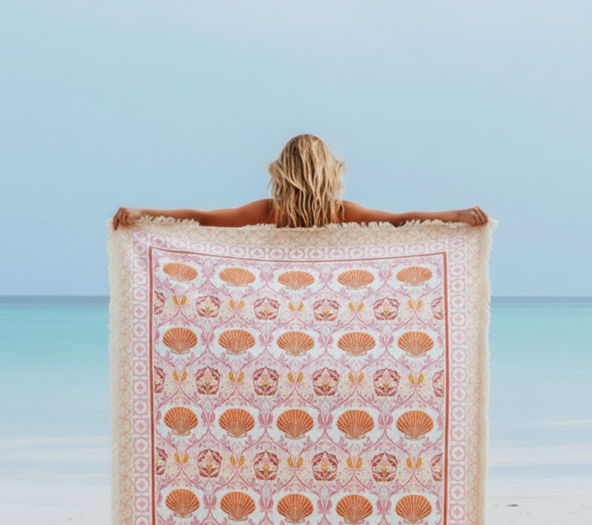 The XL Beach Towel Bohemia is one of those rare finds in our catalogue that seems to get picked up by every kind of retailer. It’s a star, really, for places like Queensland and anywhere with heavy tourist foot traffic, and it fits in really well with shops that have a maximalist but still “clean” brand identity. And while it does have that show-stopping effect, the towel itself - 150x200cm microfibre and soft as anything - is just as practical. We get a lot of questions about the pattern on this one. The effect of layering those orange and pink seashells with leafy patterns almost reminds us of something you might see in an understated baroque painting if it wasn’t so saturated - it’s got just the right amount of fun mixed in with those neat white tassels at the bottom and top. Retailers will also get a co-ordinating drawstring bag which is just spot on for display even at entryways or beside checkout counters in the summer months. Machine washable with cold water, this one’s high on durability too (even higher when you use a gentle cycle).