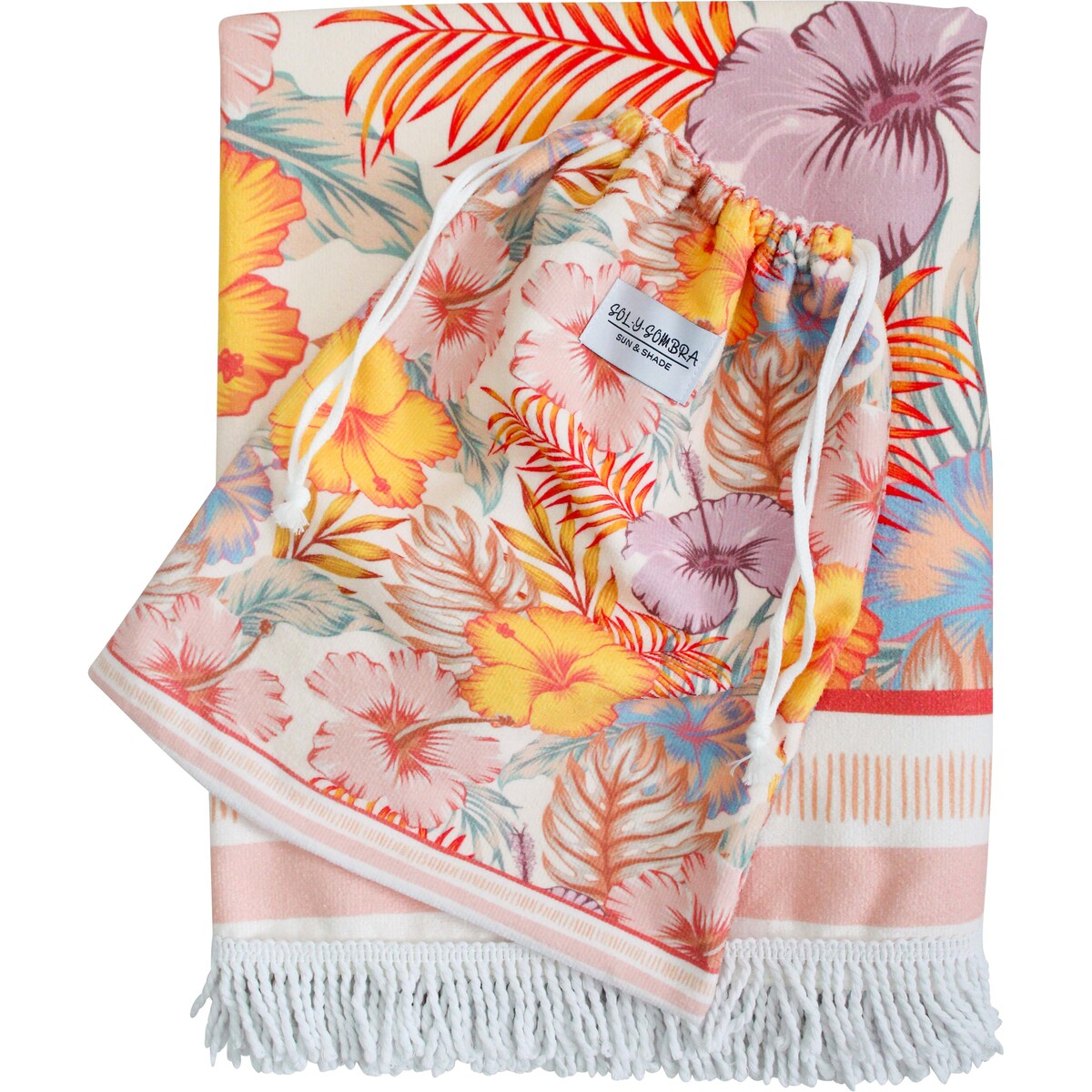 XL beach towel that comes with co-ordinating drawstring bag. Machine washable on cold water/ gentle cycle.